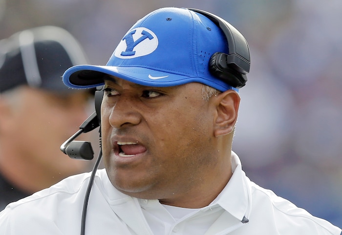 BYU head coach Kalani Sitake, center, looks on during the first half of an NCAA college football game against Utah, Saturday, Sept. 10, 2016, in Salt Lake City. (AP Photo/Rick Bowmer)
