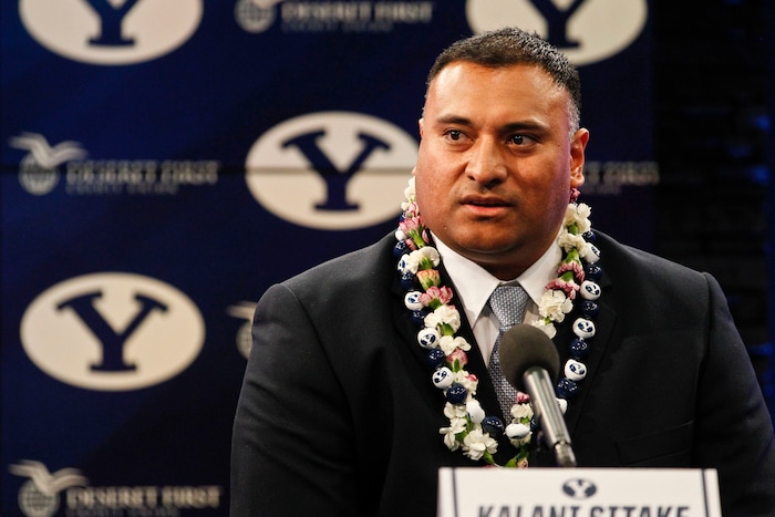 Kalani Sitake is introduced as the new football head coach for Brigham Young University during a news conference, Monday, Dec. 21, 2015 at the BYU Broadcasting Building in Provo, Utah. (Sammy Jo Hester/The Daily Herald via AP) MANDATORY CREDIT
