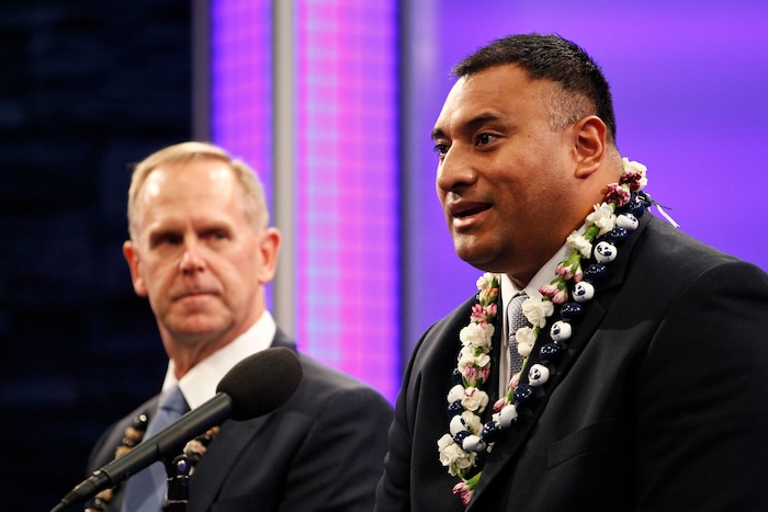 Kalani Sitake, right, is introduced as the new football head coach for Brigham Young University during a news conference, Monday, Dec. 21, 2015 at the BYU Broadcasting Building in Provo, Utah. (Sammy Jo Hester/The Daily Herald via AP) MANDATORY CREDIT