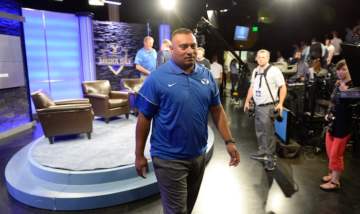 BYU head coach Kalani Sitake concludes a roundtable discussion in Studio C of the broadcast center as part of BYU Football Media Day on Friday, June 23, 2017.