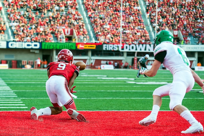 Nine months after catching the last pass of the 2016 season at Rice-Eccles Stadium, Darren Carrington II was back in the venue Thursday night. Wearing a Utah uniform, the former Oregon receiver made the first catch of 2017 on the same field.