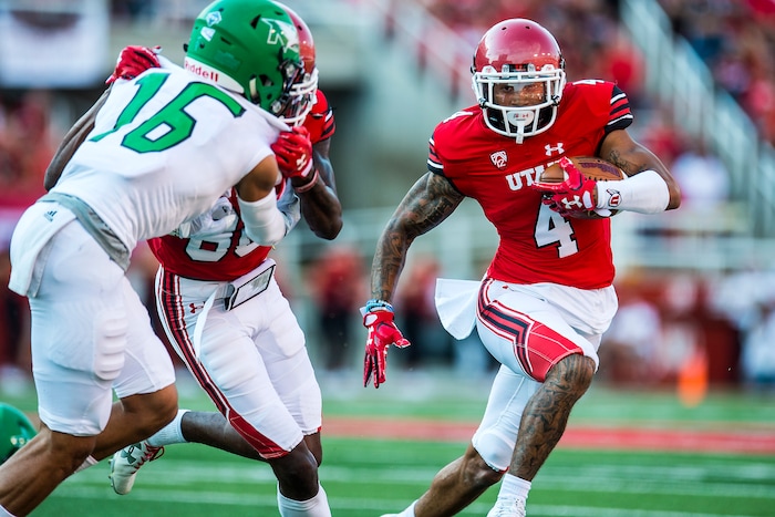 (Chris Detrick | The Salt Lake Tribune) Utah Utes wide receiver Troy McCormick Jr. (4) during the game at Rice-Eccles Stadium Thursday, August 31, 2017. Utah Utes are leading North Dakota Fighting Hawks 17-9 at halftime.