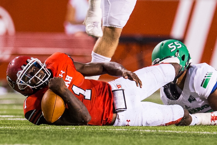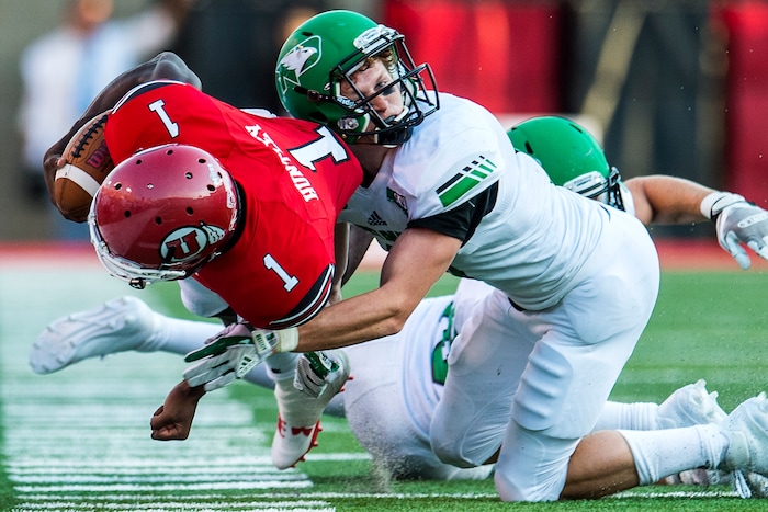 (Chris Detrick | The Salt Lake Tribune) Utah Utes quarterback Tyler Huntley (1) is tackled by North Dakota Fighting Hawks linebacker Jade Lawrence (2) during the game at Rice-Eccles Stadium Thursday, August 31, 2017. Utah Utes are leading North Dakota Fighting Hawks 17-9 at halftime.
