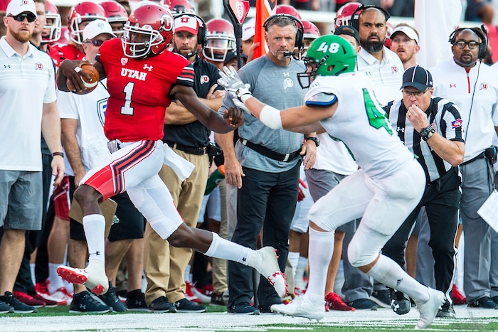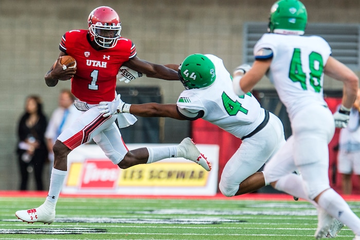 (Chris Detrick | The Salt Lake Tribune) Utah Utes quarterback Tyler Huntley (1) runs past North Dakota Fighting Hawks linebacker Donnell Rodgers (44) during the game at Rice-Eccles Stadium Thursday, August 31, 2017. Utah Utes are leading North Dakota Fighting Hawks 17-9 at halftime.