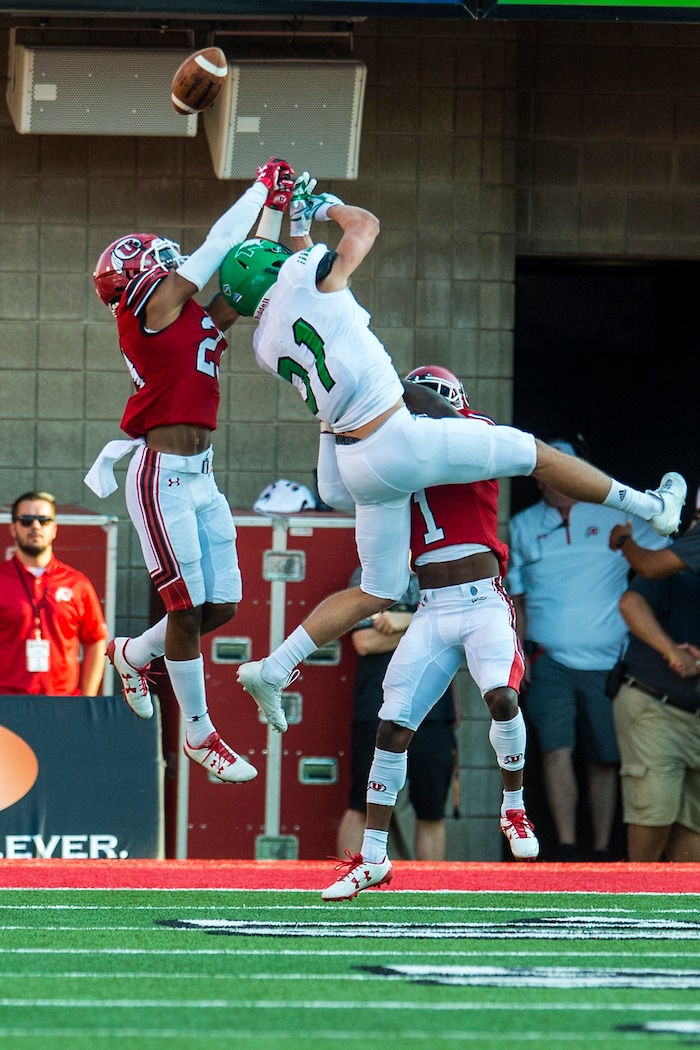 (Chris Detrick | The Salt Lake Tribune) Utah Utes defensive back Julian Blackmon (23) and Utah Utes defensive back Boobie Hobbs (1) defend North Dakota Fighting Hawks wide receiver Noah Wanzek (31) during the game at Rice-Eccles Stadium Thursday, August 31, 2017. Utah Utes are leading North Dakota Fighting Hawks 17-9 at halftime.