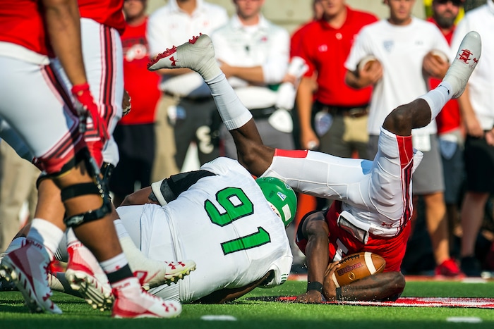 (Chris Detrick | The Salt Lake Tribune) Utah Utes wide receiver Raelon Singleton (11) looses his helmet after being tackled during the game at Rice-Eccles Stadium Thursday, August 31, 2017. Utah Utes are leading North Dakota Fighting Hawks 17-9 at halftime.