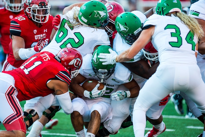 (Chris Detrick | The Salt Lake Tribune) North Dakota Fighting Hawks running back John Santiago (22) is tackled by Utah Utes defensive end Kylie Fitts (11) and other Utah defenders during the game at Rice-Eccles Stadium Thursday, August 31, 2017. Utah Utes are leading North Dakota Fighting Hawks 17-9 at halftime.