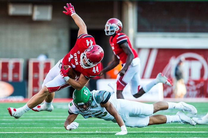 (Chris Detrick | The Salt Lake Tribune) North Dakota Fighting Hawks linebacker Jaxson Turner (15) tackles Utah Utes linebacker Jake Jackson (44) during the game at Rice-Eccles Stadium Thursday, August 31, 2017. Utah Utes are leading North Dakota Fighting Hawks 17-9 at halftime.