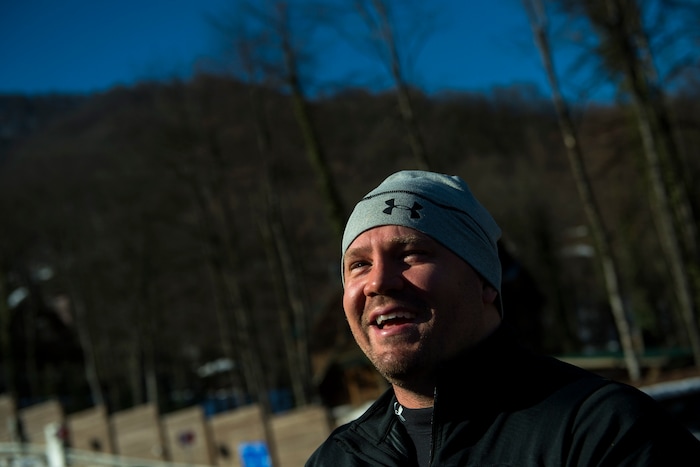 Bobsled athlete Steven Holcomb talks to members of the media after a practice run at the Sanki Sliding Center before the start of the 2014 Sochi Olympics Thursday February 6, 2014.