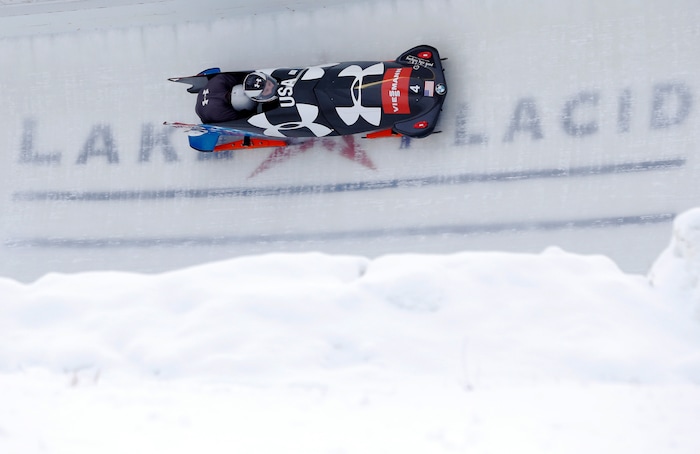 Driver Steven Holcomb with Carlo Valdes, James Reed and brakeman Samuel McGuffie, of the United States, compete in the four-man bobsled finishing second in World Cup race on Saturday, Dec. 17, 2016, in Lake Placid, N.Y. (AP Photo/Hans Pennink)