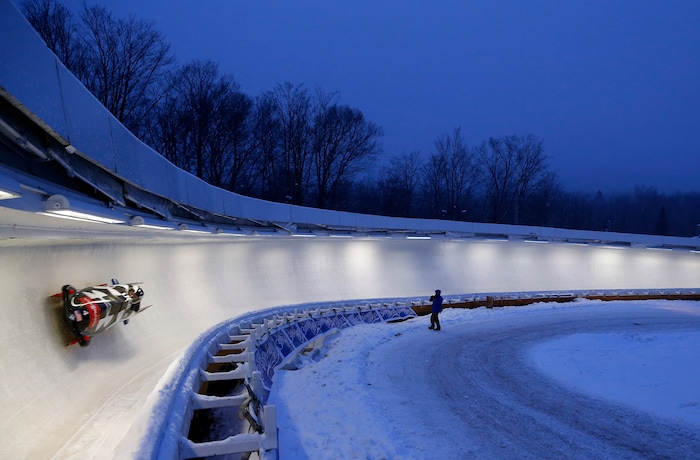 Driver Steven Holcomb with Frank Delduca, Carlo Valdes and brakeman Samuel McGuffie compete in the four-man bobsled World Cup race on Saturday, Jan. 9, 2016, in Lake Placid, N.Y. (AP Photo/Mike Groll)