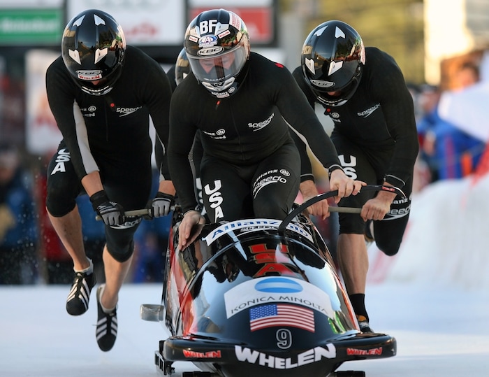 Bob USA 1 starts with pilot Steven Holcomb, in front, Steve Mesler, Brock Kreitzenburg and Paul Jovanovic, behind from left, to the first of four runs of the Four Men Bob World Championship in St. Moritz, Switzerland, Saturday, Feb. 3, 2007. (AP Photo/Eckehard Schulz)