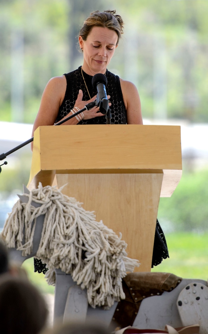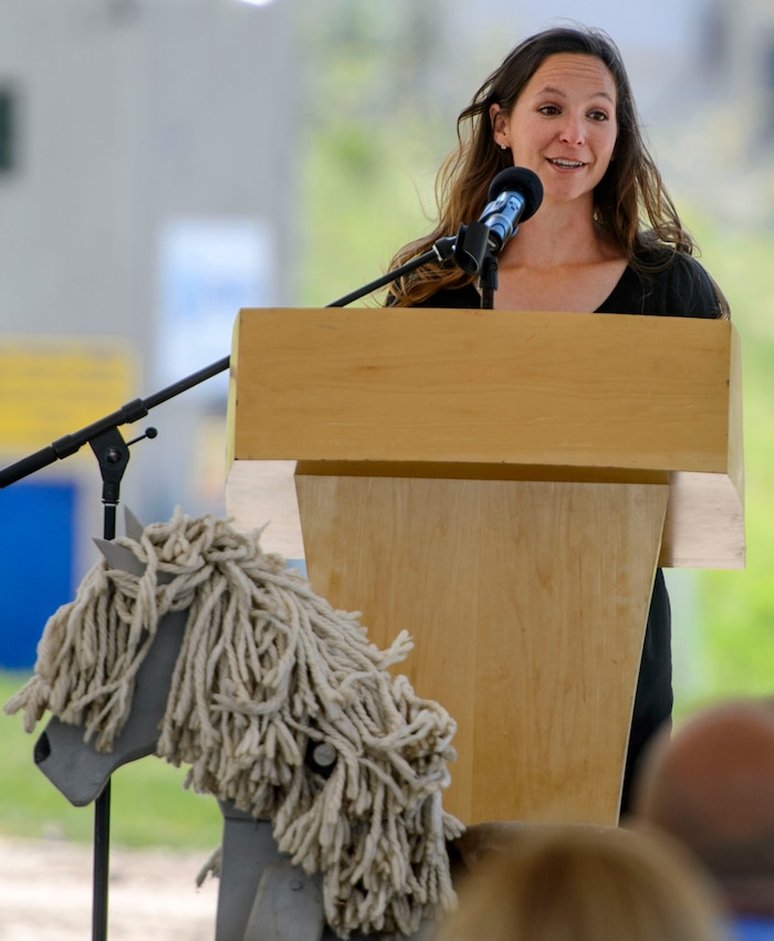 Stephanie Petersen pays tribute to her brother Steve Holcomb as Park City and the Holcomb family and friends hold a memorial to honor the late 37-year-old Park City gold medalist bobsledder who passed away suddenly in Lake Placid last month. The remembrance was held in the summer pavilion at Utah Olympic Park Park City Saturday June 10, 2017.