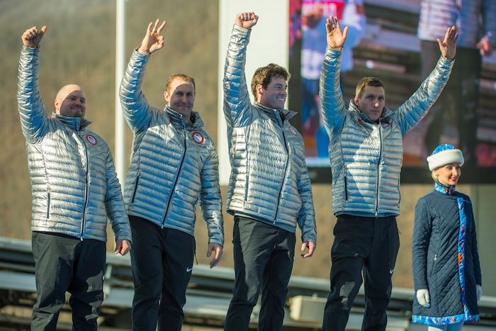 USA's Steven Holcomb, Chris Fogt, Curtis Tomasevicz, and Steve Langton, celebrate during the medal ceremony at the finish of the four-man bobsled at Sanki Sliding Center during the 2014 Sochi Olympics Sunday February 23, 2014. They won the bronze medal with a cumulative time of 3:40.99.