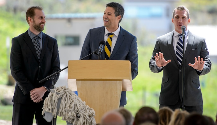 Olympic bobsled medalists Curt Tomasevicz, Steve Messler and Chris Fogt share a laugh as they tell stories of their long time friend and teammate Steve Holcomb as Park City and the Holcomb family and friends hold a memorial to honor the late 37-year-old Park City gold medalist bobsledder who passed away suddenly in Lake Placid last month. The remembrance was held in the summer pavilion at Utah Olympic Park Park City Saturday June 10, 2017. Tomasevicz and Messler won Olympic Gold with Holcomb in 2010 and Fogt won a bronze medal with Holcomb in 2014.