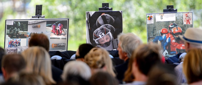 Photographs of Steve Holcomb surround the audience as Park City and the Holcomb family and friends hold a memorial to honor the late 37-year-old Park City gold medalist bobsledder who passed away suddenly in Lake Placid last month. The remembrance was held in the summer pavilion at Utah Olympic Park Park City Saturday June 10, 2017.