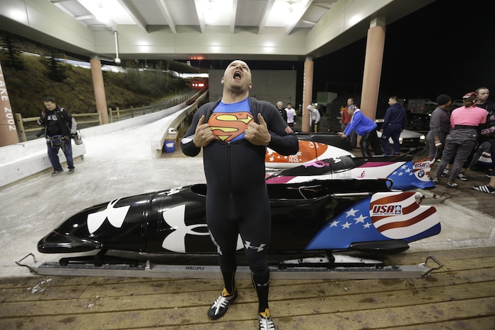 Steve Holcomb displays his Superman shirt as he poses for a photograph in front of his sled after the United States four-man bobsled team trials on Saturday, Oct. 26, 2013, in Park City, Utah. Holcomb and his crew came in first place. (AP Photo/Rick Bowmer)