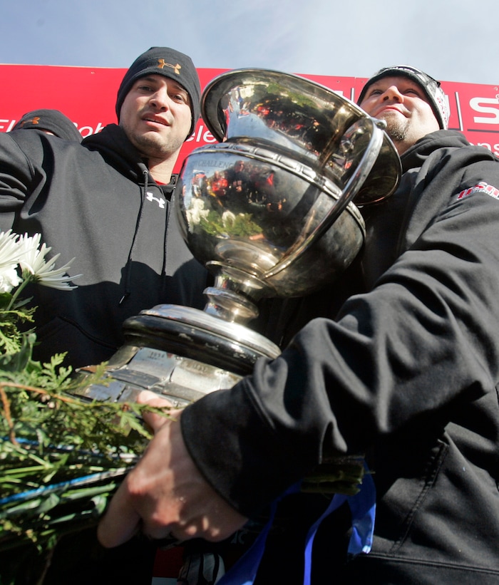 Team USA 1 pilot Steven Holcomb holds the winner trophy during the World Cup winner ceremony of the 4-men Bob World Cup competition in Innsbruck Igls, Austria, on Sunday Jan. 24, 2010. The Team USA 1 won the World Cup overall. (AP Photo/Christof Stache)