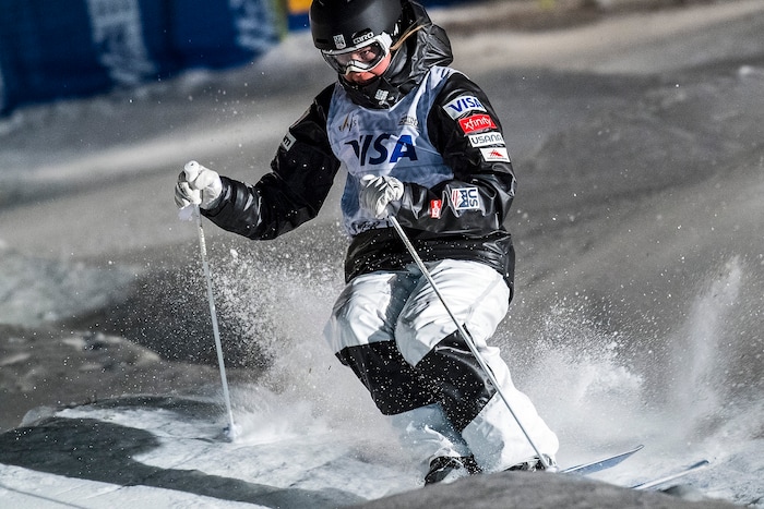 (Chris Detrick | The Salt Lake Tribune) USA's Keaton McCargo (9) competes in the Ladies' Mogul Finals during the FIS Visa Freestyle International Ski World Cup at Deer Valley Resort Thursday, January 11, 2018. McCargo finished in seventh place with a score of 78.44.