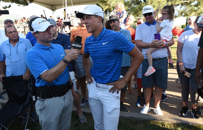 (Francisco Kjolseth | The Salt Lake Tribune) Cameron Champ from Sacramento, CA, is interviewed following his win in the Utah Championship golf event on the Web.com Tour at Oakridge Country Club in Farmington on Sunday, July 15, 2018.