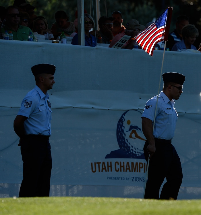(Francisco Kjolseth | The Salt Lake Tribune) Joseph Hess, left, and Joseph Gourley of Hill Air Force Base pull the 18th hole flag on the final day of the Utah Championship golf event on the Web.com Tour at Oakridge Country Club in Farmington on Sunday, July 15, 2018.