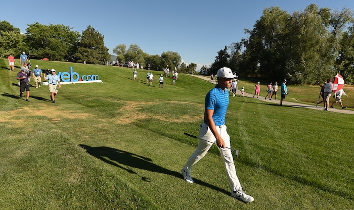 (Francisco Kjolseth | The Salt Lake Tribune) Cameron Champ from Sacramento, CA, plays his final hole of the Utah Championship golf event on the Web.com Tour at Oakridge Country Club in Farmington on Sunday, July 15, 2018, to win the championship.