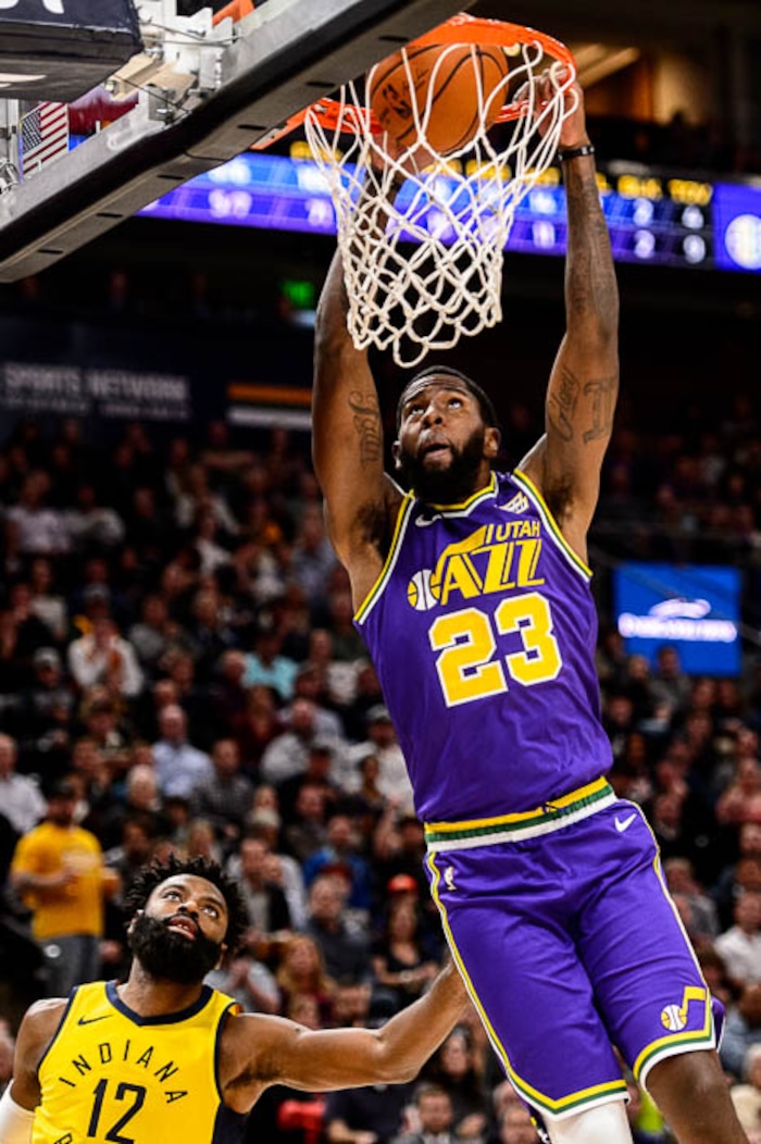 . Utah Jazz v Indiana Pacers, NBA basketball at Vivint Utah Jazz forward Royce O'Neale (23) dunks over Indiana Pacers guard Tyreke Evans (12)SmartHome Arena in Salt Lake City on Monday Nov. 26, 2018.