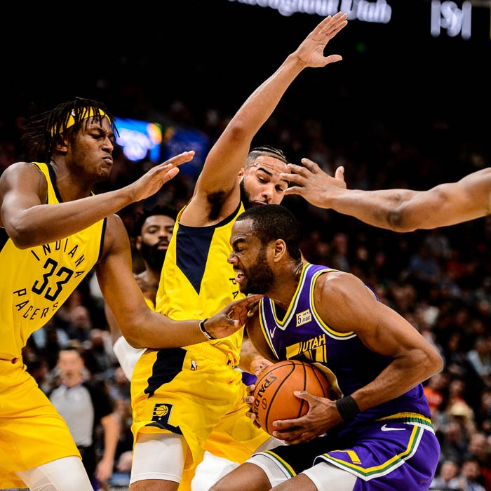 Utah Jazz guard Alec Burks (10) is triple-teamed. Utah Jazz v Indiana Pacers, NBA basketball at Vivint SmartHome Arena in Salt Lake City on Monday Nov. 26, 2018.