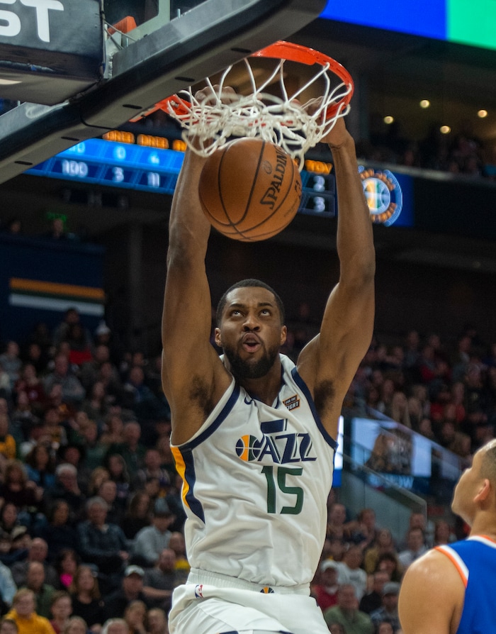 (Rick Egan | The Salt Lake Tribune) Utah Jazz forward Derrick Favors (15) dunks he ball, in NBA action between Utah Jazz and New York Knicks, in Salt Lake City, Saturday, Dec. 29, 2018.