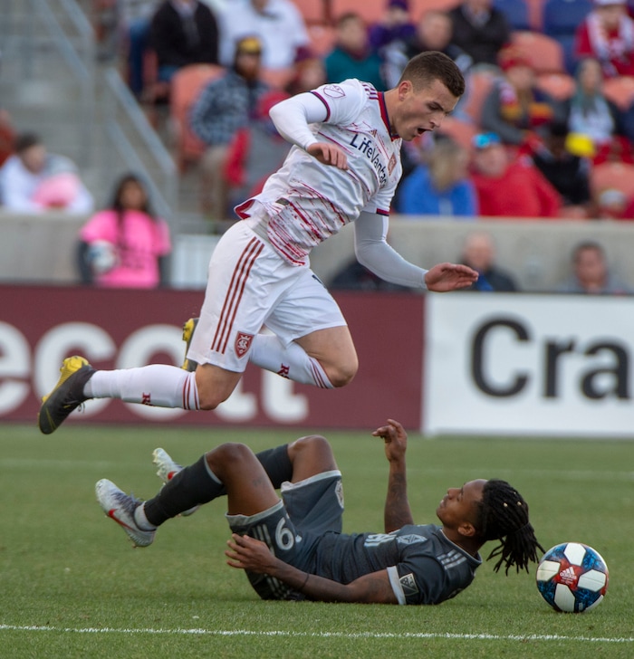 Real Salt Lake forward Brooks Lennon (12) flies over Vancouver Whitecaps forward Yordi Reyna (29)), in MLS soccer action at Rio Tinto Stadium in Sandy, Saturday, March 9, 2019.