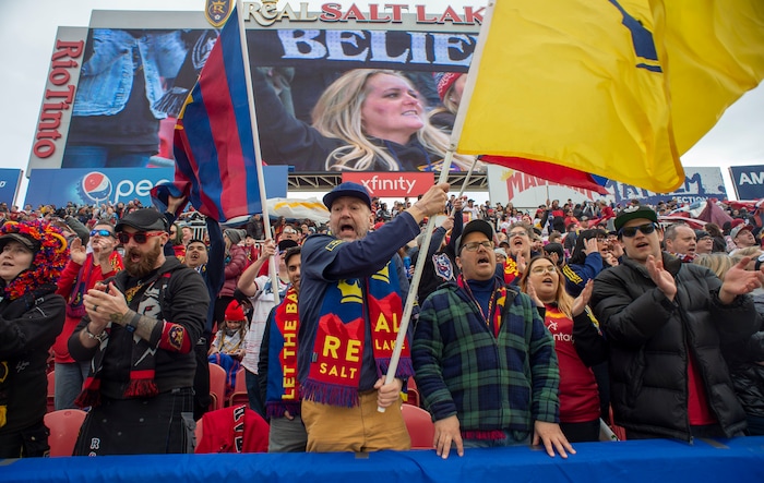 (Rick Egan | The Salt Lake Tribune) Fans in the south end zone cheer for Real Salt Lake, in MLS soccer action at Rio Tinto Stadium in Sandy, Saturday, March 9, 2019.