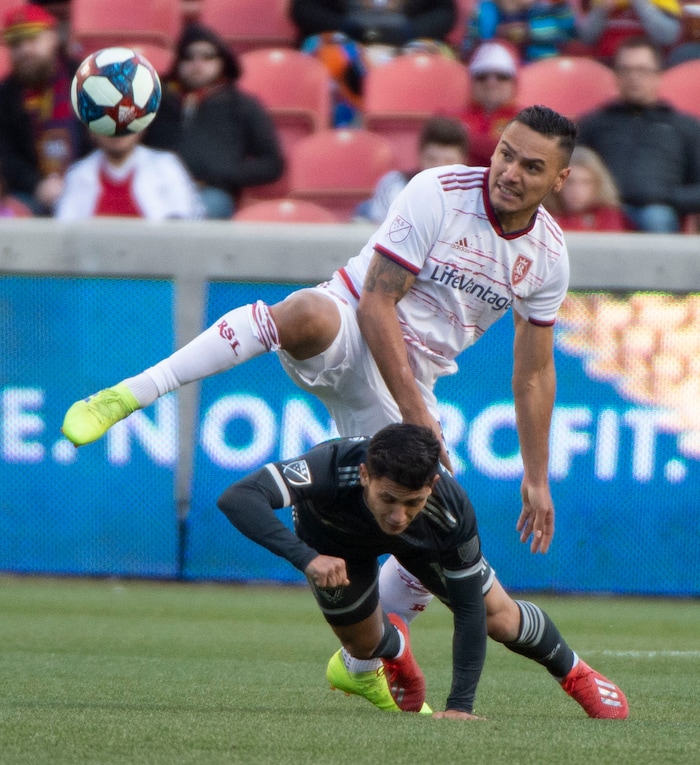 (Rick Egan | The Salt Lake Tribune) Real Salt Lake defender Marcelo Silva (30) collides with Vancouver Whitecaps forward Fredy Montero (12), in MLS soccer action at Rio Tinto Stadium in Sandy, Saturday, March 9, 2019.