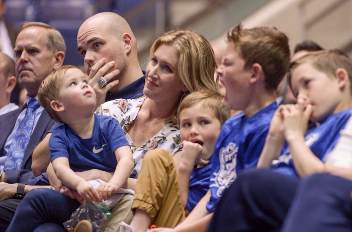 Leah Hogsten | The Salt Lake Tribune Garrett Rose and his family listen as his father gives remarks on his retirement. BYU head basketball coach Dave Rose announced on Tuesday that he was retiring after a 14-year career in which he became BYUÕs all-time winningest menÕs basketball coach.
