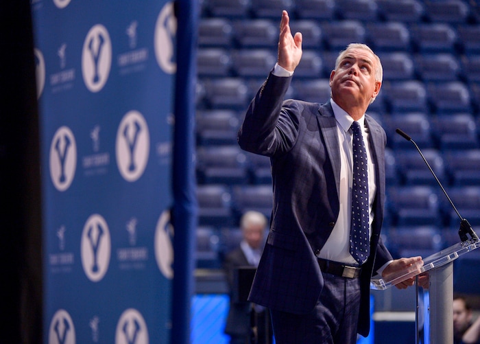 Leah Hogsten | The Salt Lake Tribune "IÕve always felt like these were numbers, just numbers on a page and people tell me at times they are impressive numbers," said BYU coach Dave Rose, pointing to his record shown on a big screen. "What IÕll always remember are the players, the relationships IÕve had with the guys." Dave Rose announced on Tuesday that he was retiring after a 14-year career in which he became BYUâs all-time winningest menâs basketball coach.
