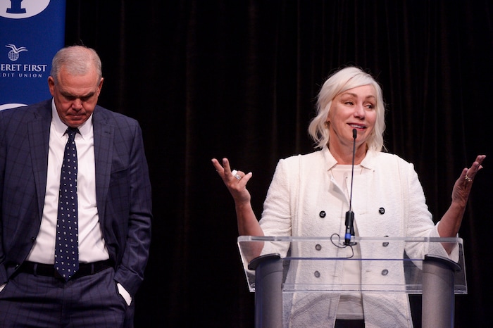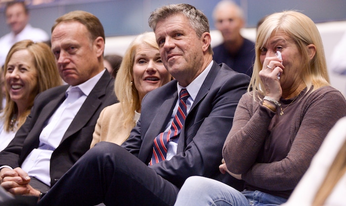Leah Hogsten | The Salt Lake Tribune Cheryl Rose hugs friends prior to her husband announcing his retirement. Dave Rose announced on Tuesday that he was retiring after a 14-year career in which he became BYU's all-time winningest men's basketball coach.