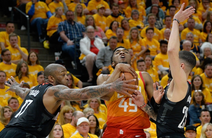 (Francisco Kjolseth | The Salt Lake Tribune) Houston Rockets forward PJ Tucker (17) and Houston Rockets guard Austin Rivers (25) put the squeeze on Utah Jazz guard Donovan Mitchell (45) in Game 3 of a first-round NBA basketball playoff series in Salt Lake City, Saturday, April 20, 2019.