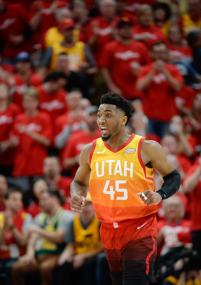 (Francisco Kjolseth | The Salt Lake Tribune) Utah Jazz guard Donovan Mitchell (45) celebrates a three pointer against the Rockets in Game 3 loss of 101-104 of a first-round NBA basketball playoff series in Salt Lake City, Saturday, April 20, 2019.