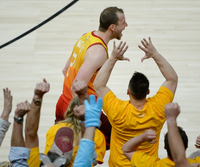 (Francisco Kjolseth | The Salt Lake Tribune) Utah Jazz forward Joe Ingles (2) celebrates a three pointer in the final second of the first half against the Rockets in Game 3 of a first-round NBA basketball playoff series in Salt Lake City, Saturday, April 20, 2019.