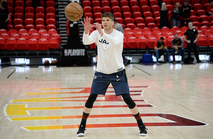 (Francisco Kjolseth | The Salt Lake Tribune) Utah Jazz guard Kyle Korver (26) warms up before Game 3 of a first-round NBA basketball playoff series against the Rockets in Salt Lake City, Saturday, April 20, 2019.