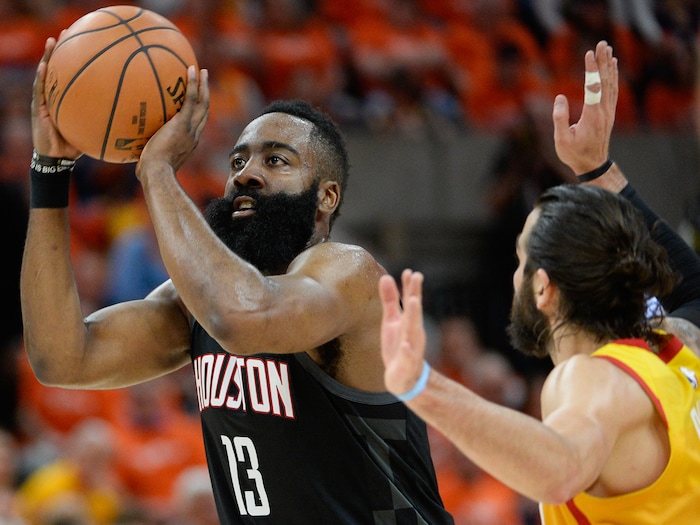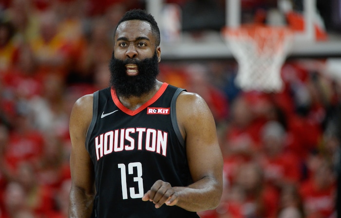 (Francisco Kjolseth | The Salt Lake Tribune) Houston Rockets guard James Harden (13) and his infamous beard takes on the Jazz in Game 3 of a first-round NBA basketball playoff series in Salt Lake City, Saturday, April 20, 2019.
