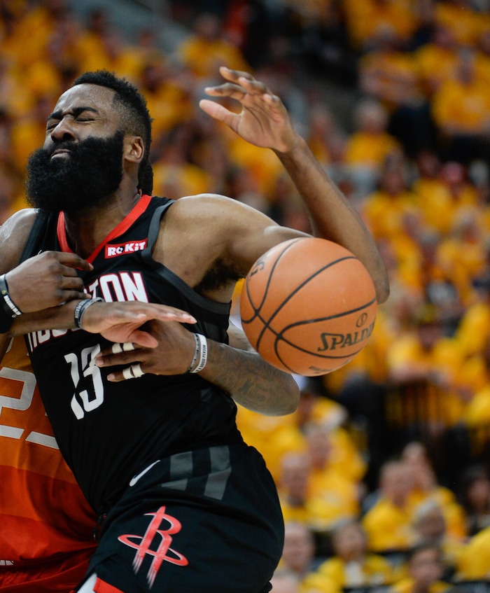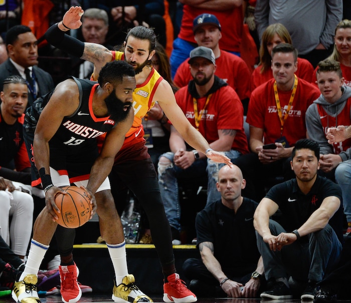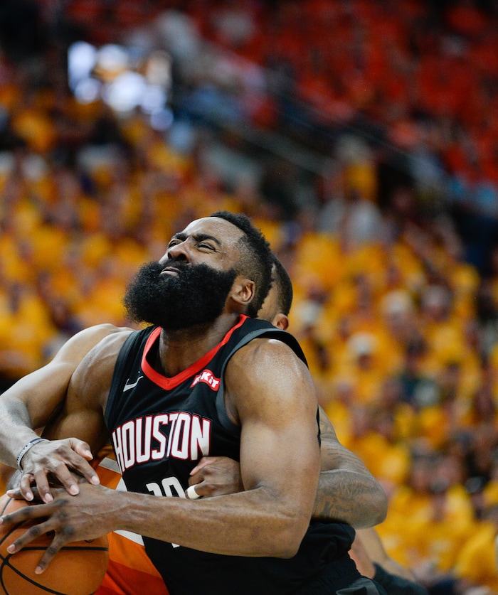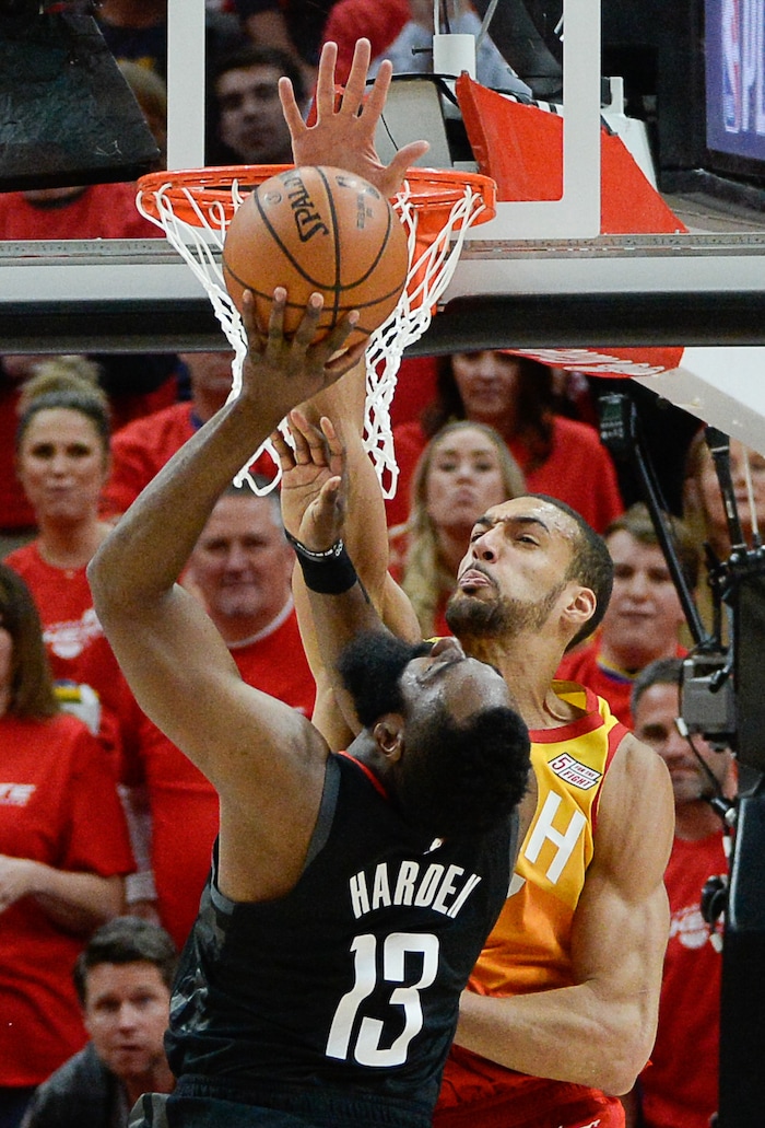 (Francisco Kjolseth | The Salt Lake Tribune) Houston Rockets guard James Harden (13) hits a wall against Utah Jazz center Rudy Gobert (27) in Game 3 of a first-round NBA basketball playoff series in Salt Lake City, Saturday, April 20, 2019.