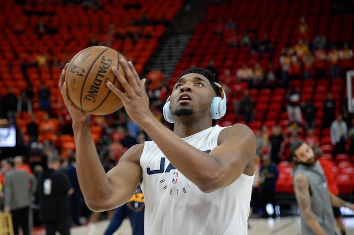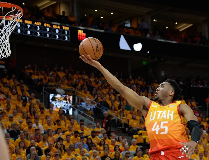 (Francisco Kjolseth | The Salt Lake Tribune) Utah Jazz guard Donovan Mitchell (45) warms up prior to Game 3 of a first-round NBA basketball playoff series against the Rockets in Salt Lake City, Saturday, April 20, 2019.