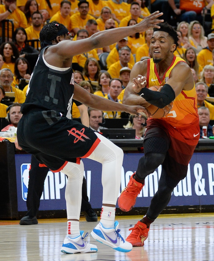 (Francisco Kjolseth | The Salt Lake Tribune) Utah Jazz guard Donovan Mitchell (45) pushes past the Rockets in Game 3 of a first-round NBA basketball playoff series in Salt Lake City, Saturday, April 20, 2019.