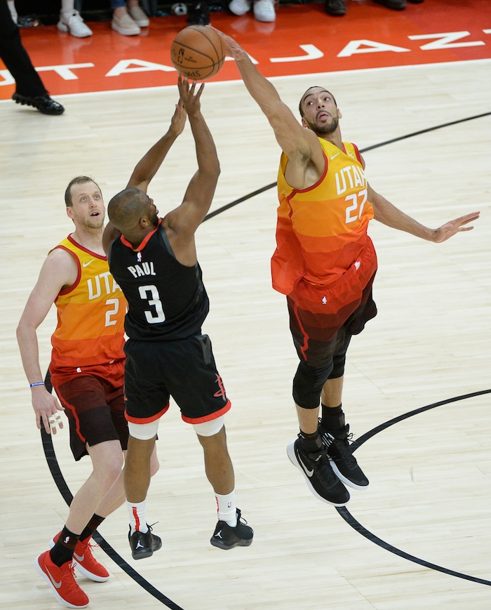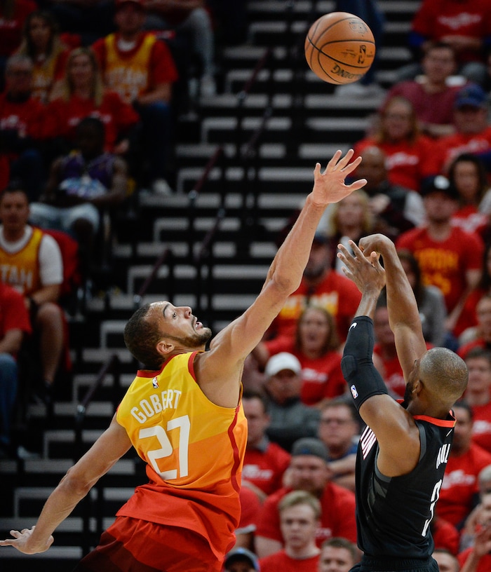 (Francisco Kjolseth | The Salt Lake Tribune) Utah Jazz center Rudy Gobert (27) tries to block Houston Rockets guard Chris Paul (3) in Game 3 of a first-round NBA basketball playoff series in Salt Lake City, Saturday, April 20, 2019.