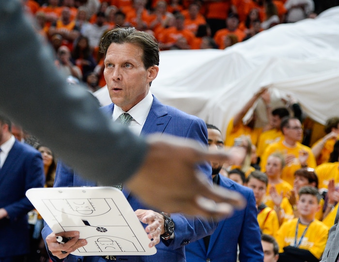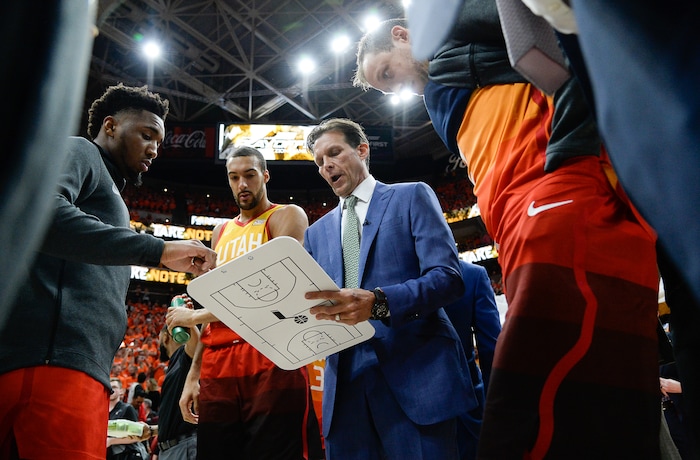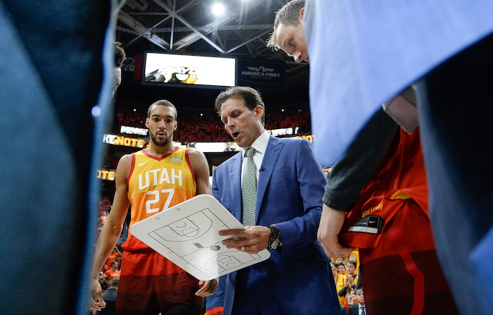 (Francisco Kjolseth | The Salt Lake Tribune) Utah Jazz Coach Quin Snyder confers with his team in Game 3 of a first-round NBA basketball playoff series against the Rockets in Salt Lake City, Saturday, April 20, 2019.