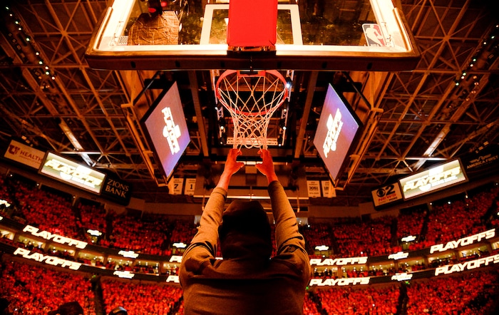 (Francisco Kjolseth | The Salt Lake Tribune) Utah Jazz forward Thabo Sefolosha (22) does his ritualistic hang off the net as flames lite up the arena prior to Game 3 of a first-round NBA basketball playoff series against the Rockets in Salt Lake City, Saturday, April 20, 2019.