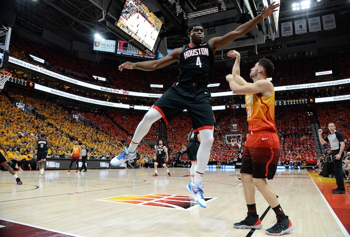(Francisco Kjolseth | The Salt Lake Tribune) Houston Rockets forward Danuel House Jr. (4) tries to block a three pointer by Utah Jazz forward Georges Niang (31) in Game 3 of a first-round NBA basketball playoff series in Salt Lake City, Saturday, April 20, 2019.