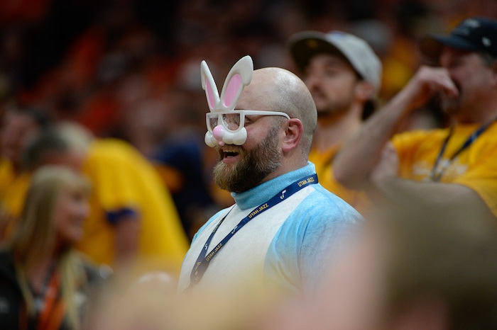 (Francisco Kjolseth | The Salt Lake Tribune) A fan has a little Easter fun in Game 3 of a first-round NBA basketball playoff series between the Jazz and the Rockets in Salt Lake City, Saturday, April 20, 2019.