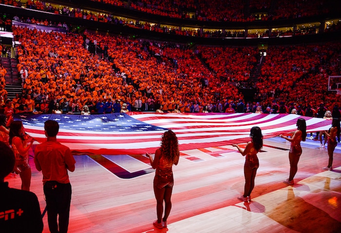(Francisco Kjolseth | The Salt Lake Tribune) A giant flag is held for the anthem prior to Game 3 of a first-round NBA basketball playoff series between the Jazz and the Rockets in Salt Lake City, Saturday, April 20, 2019.