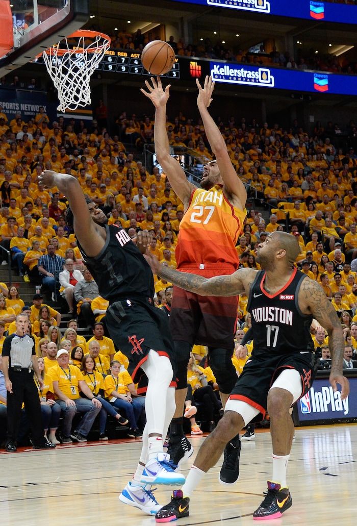 (Francisco Kjolseth | The Salt Lake Tribune) Utah Jazz center Rudy Gobert (27) rises over the Rockets in Game 3 of a first-round NBA basketball playoff series in Salt Lake City, Saturday, April 20, 2019.